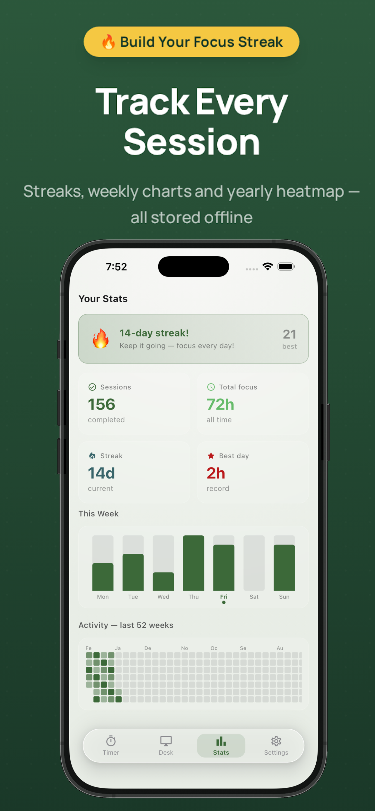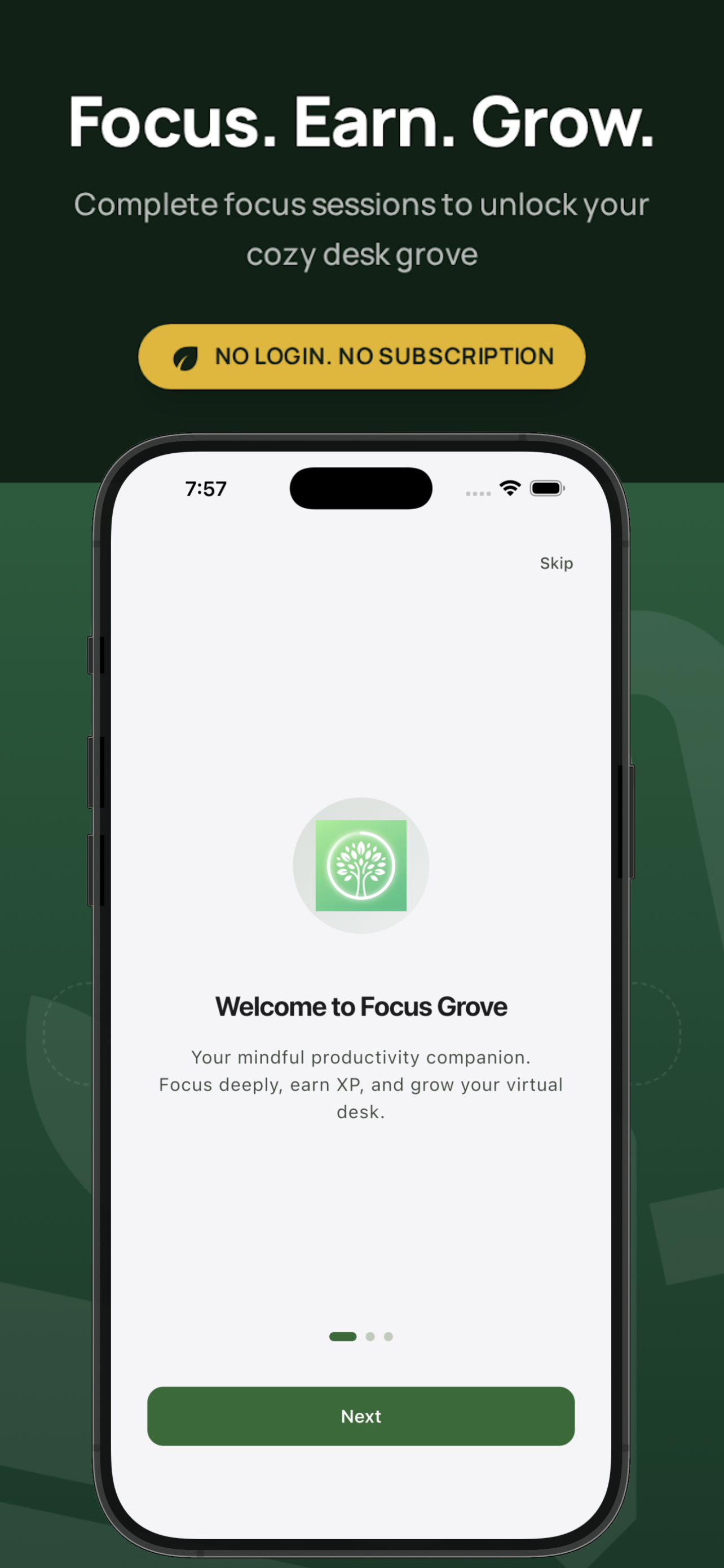 Focus Grove is an offline focus timer and Pomodoro timer that turns every study or work session into XP to grow your personal desk grove. Designed for students, remote workers and deep work enthusiasts, itβs a calm, privacy-first productivity timer with streaks, charts, widgets and a one-time Pro upgrade β no subscriptions required.