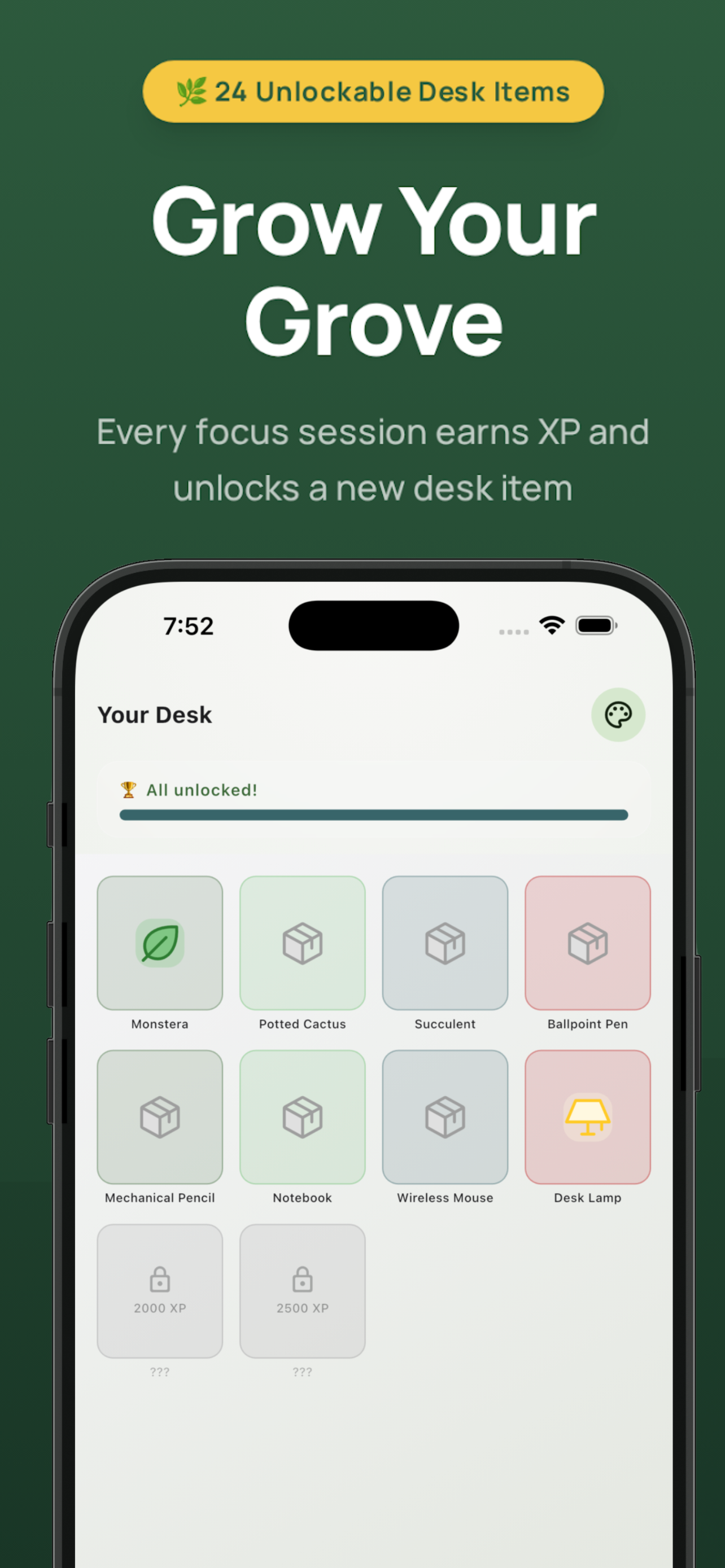 Tired of noisy productivity apps, constant signups, or paywalls just to use a simple study timer? Focus Grove keeps things simple: set a focus session, work deeply, and unlock new desk items as you earn XP from real progress. No accounts, no cloud sync β everything stays on your device.